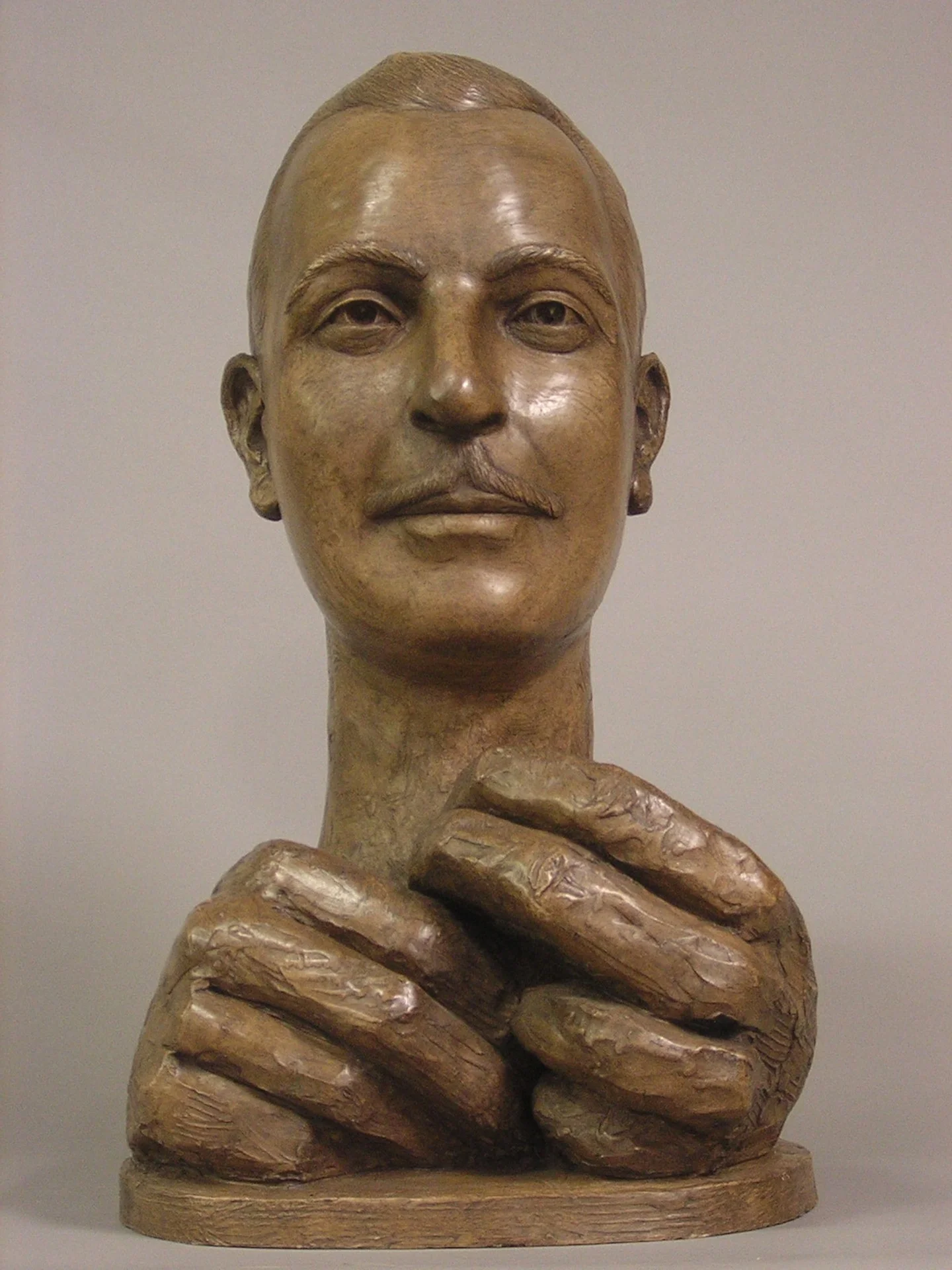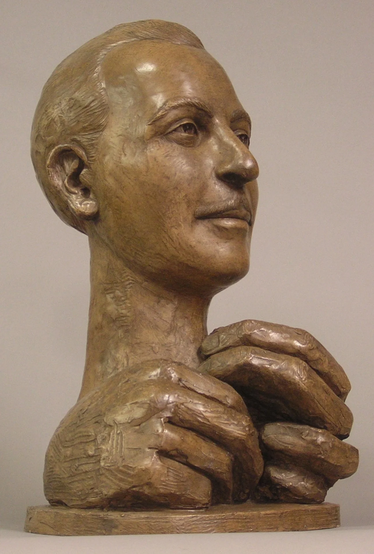 This is my original bronze sculpture of the gypsy jazz guitarist, Django Reinhardt, from which I cast only the head for the simpler version. Here, his elongated neck lends a sense of other-worldliness, and his over sized hands create a sense of monumentality and emphasize the power of his astonishing facility on the guitar, made more astonishing by the fact that two of his left-hand fingers had been uselessly crippled by fire.