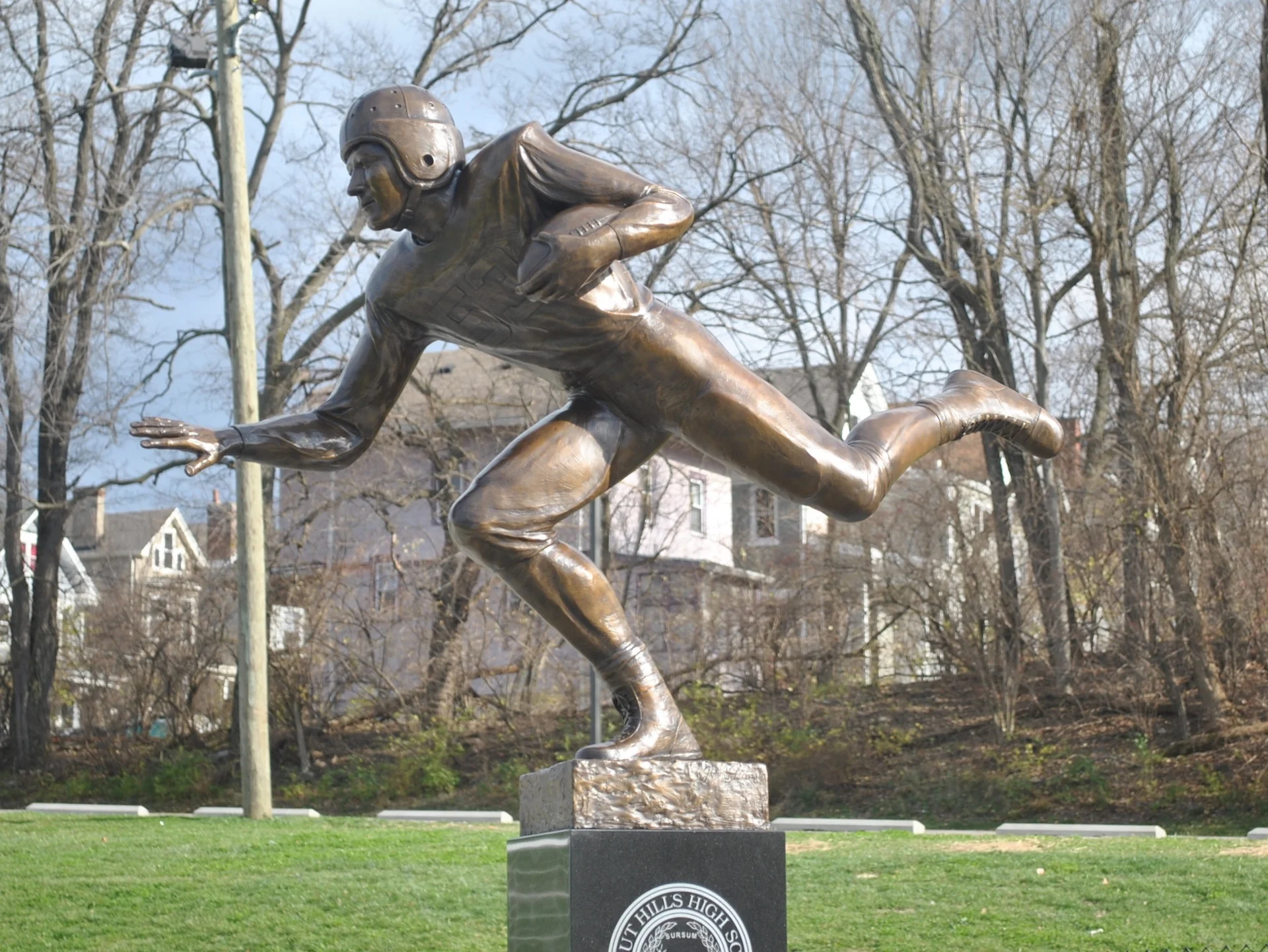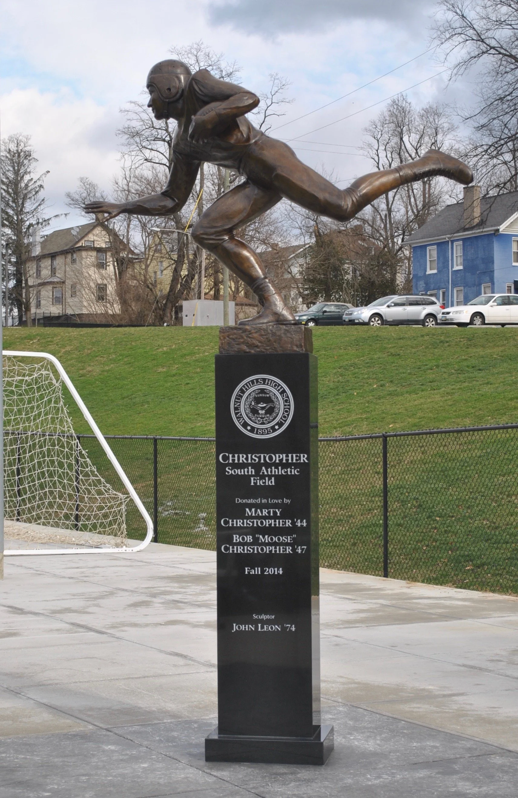 I made this life-sized, bronze, 1940's era running back for Walnut Hills High School, my alma mater. It wascommissioned by Bob & Marty Christopher, also alumni. The pose is meant to inspire an onward-and-upward feeling--"Sursum ad Summum" is the school’s motto. As a surprise to Bob I put his number from his playing days, 53, on the uniform.
